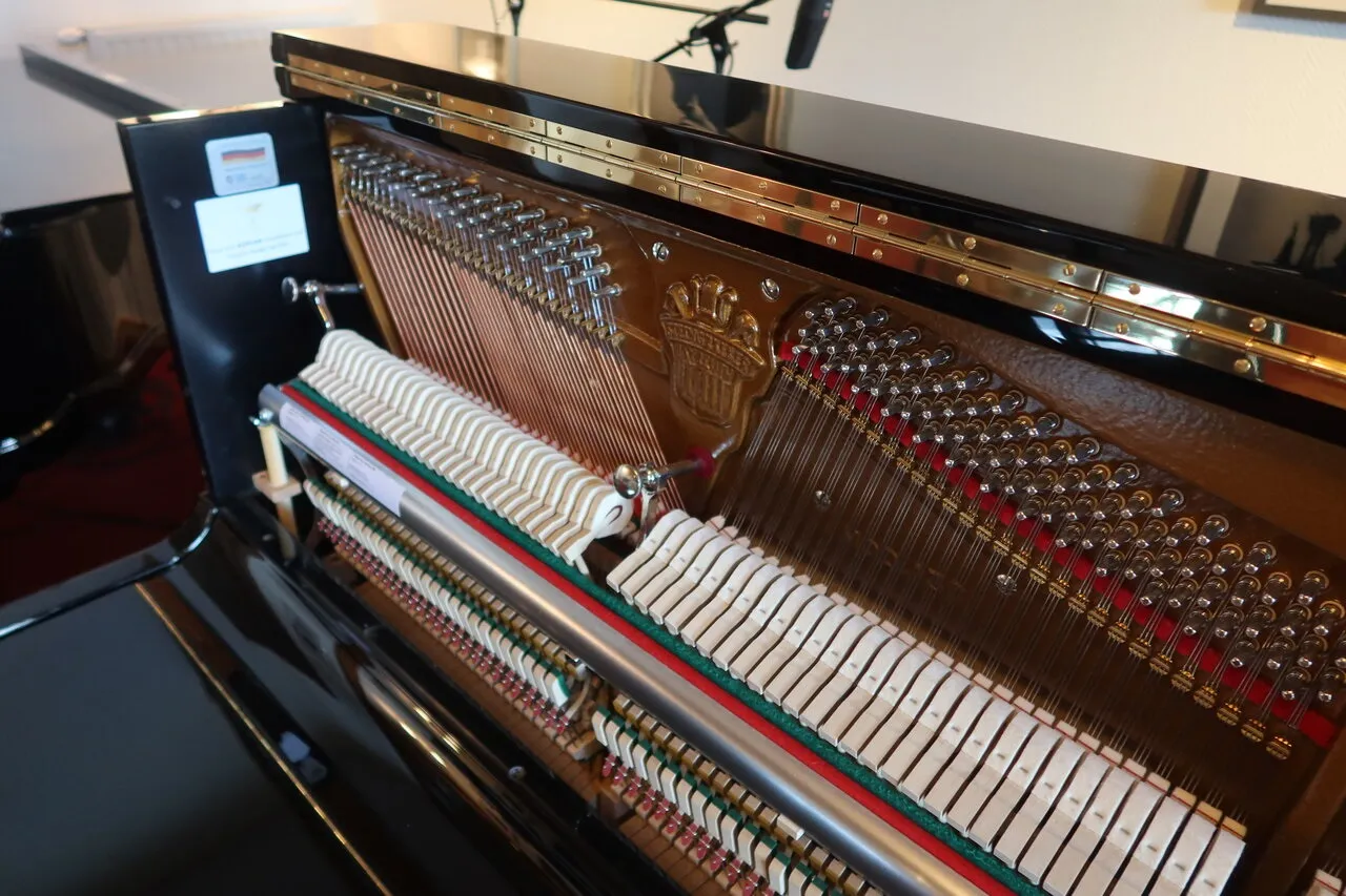 It includes bridge agraphes that ensure optimal sound transfer from the strings to the Kevlar soundboard. As a result, a 130 cm high piano has the power of a full grand piano. The piano action has been optimized so it plays tremendously fine. Keys made of high-quality plastic that breathe and feel like ivory.