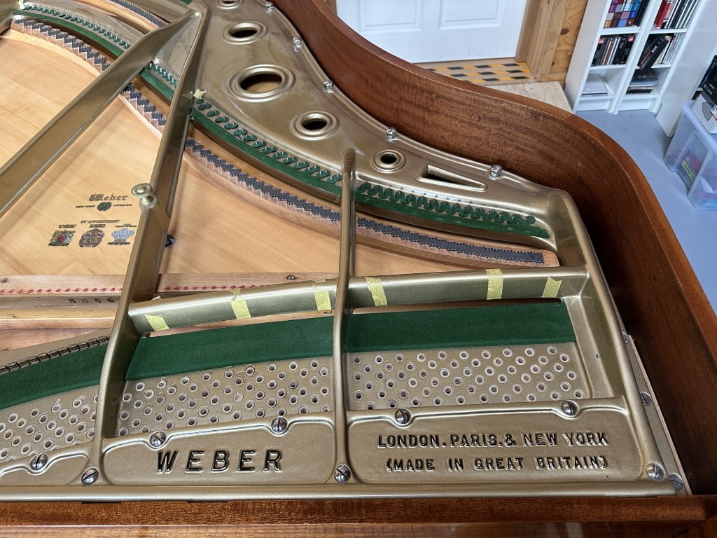 The grand piano is currently being restored to like-new condition. Both the cabinet, frame and soundboard have been resprayed in silk-matt lacquer, very similar to the original french polish.